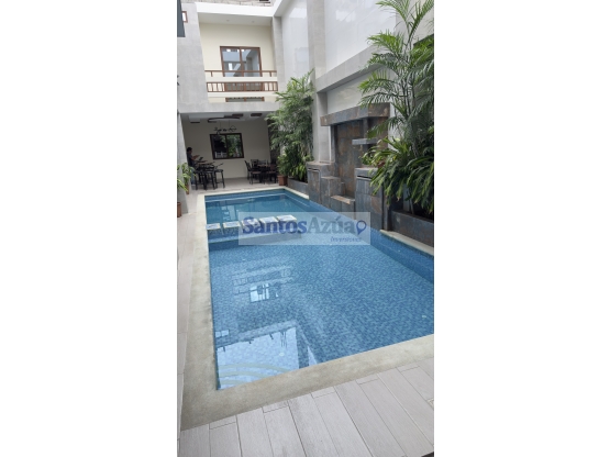 🏊 Piscina moderna, ubicada en el centro de la edificación, con cascada y acabados contemporáneos.